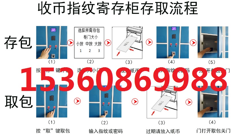 存包:按存鍵選擇大小門輸入紙幣按指紋開門---存放東西關(guān)門